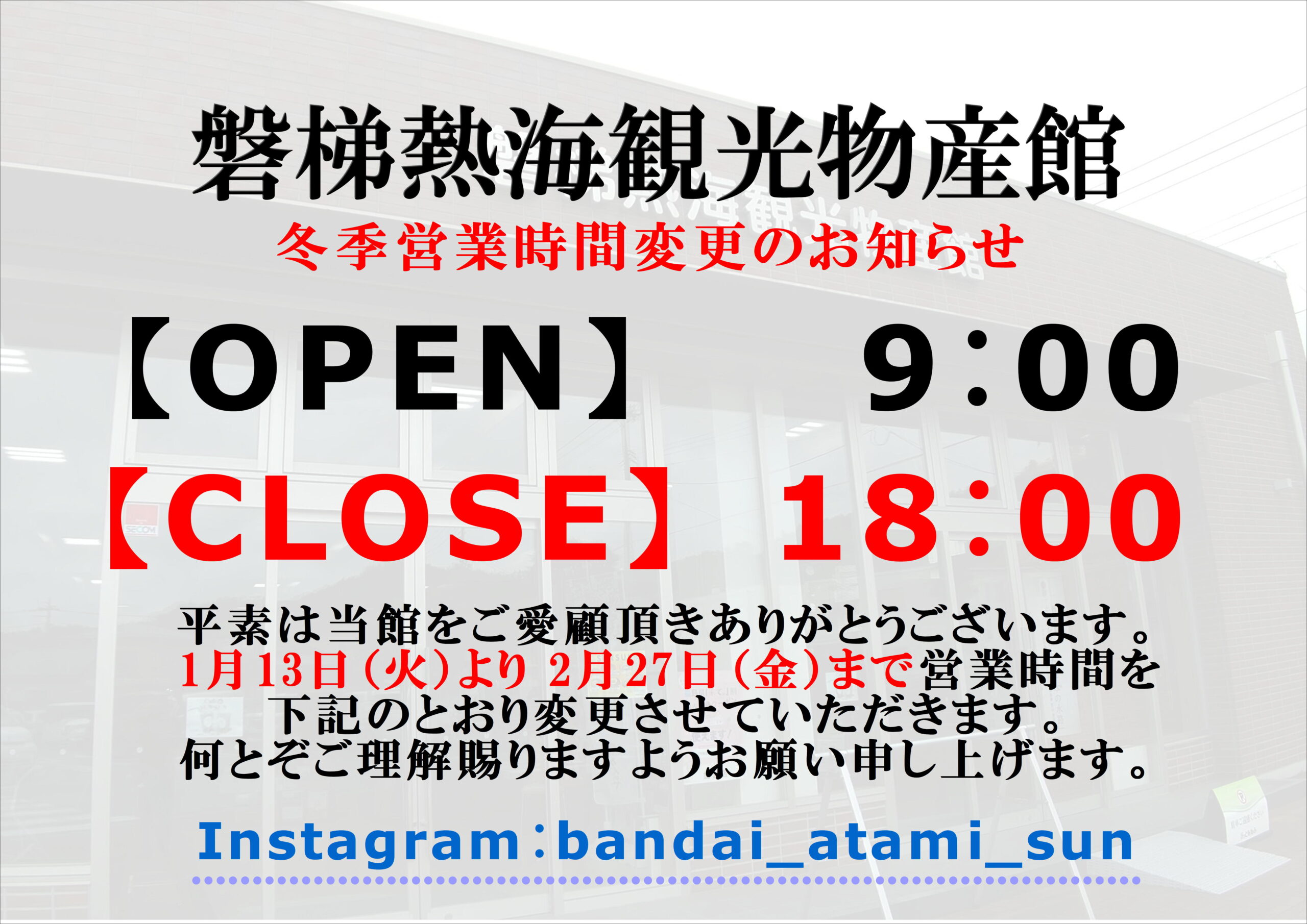 冬季営業時間変更のご案内